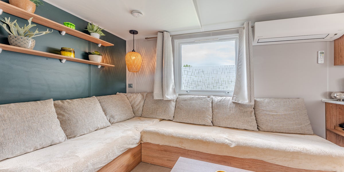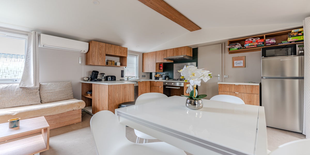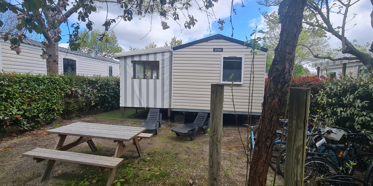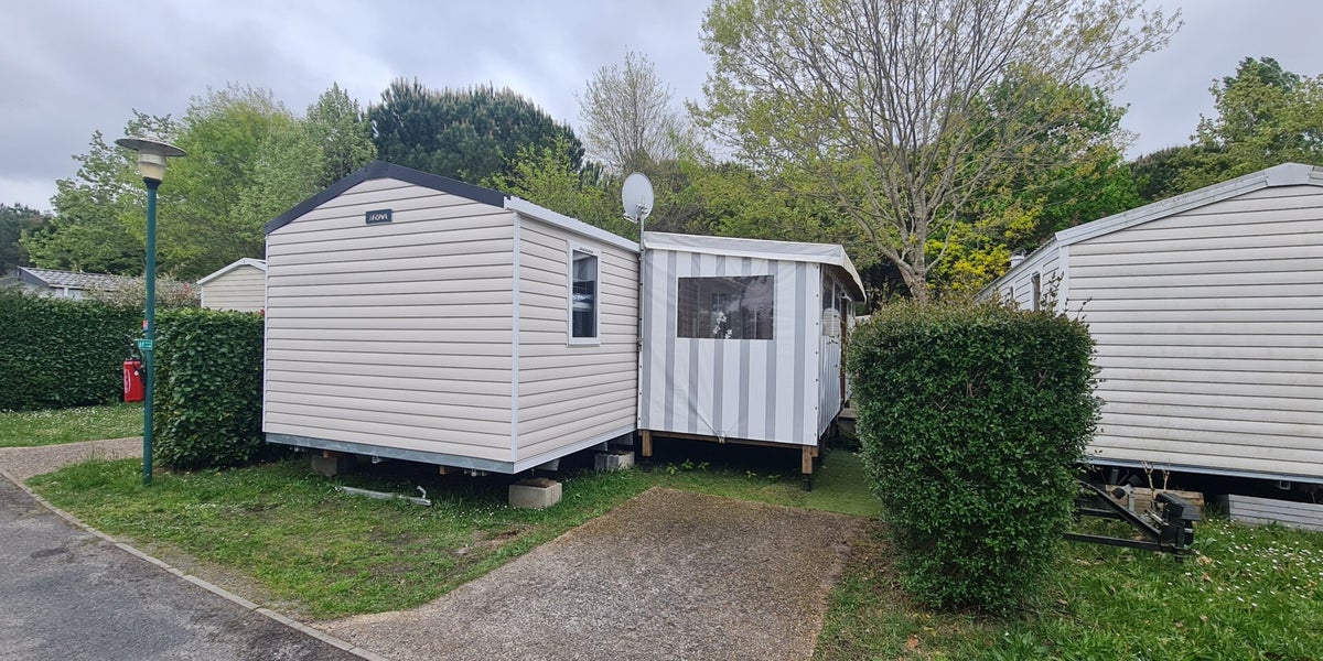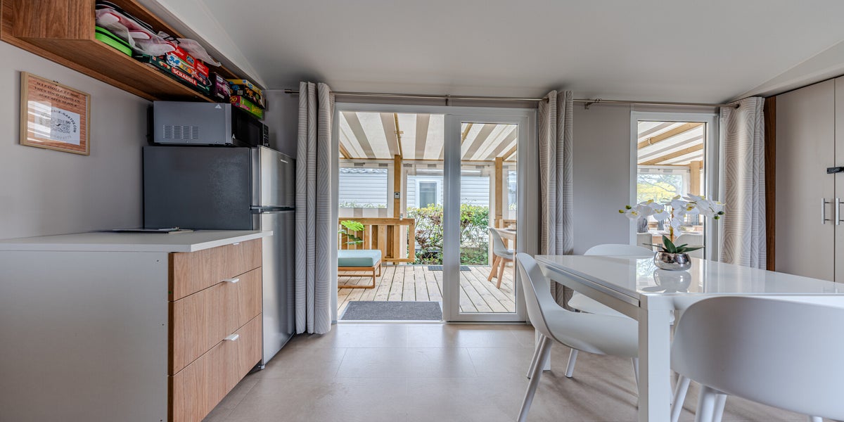 Le mobil-home haut de gamme climatisé est composé de 3 chambres et de 2 salles d'eau avec une terrasse entièrement couverte d'une capacité de 8 personnes max.